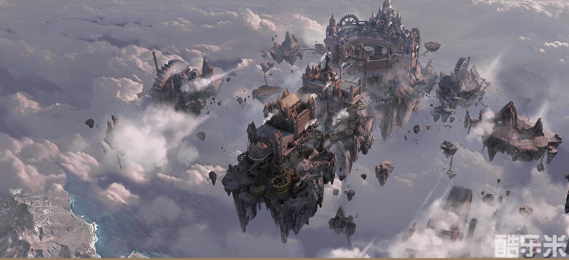 中心城镇是一座被蒸汽缠绕的钢铁城,远处朦胧可见一座浮空大型要塞,一只形似乌鸦的飞行怪物缓缓地从上空飞过,在苍茫笼罩下虽看不清它的全貌,但仍能感受到它的威猛气势。