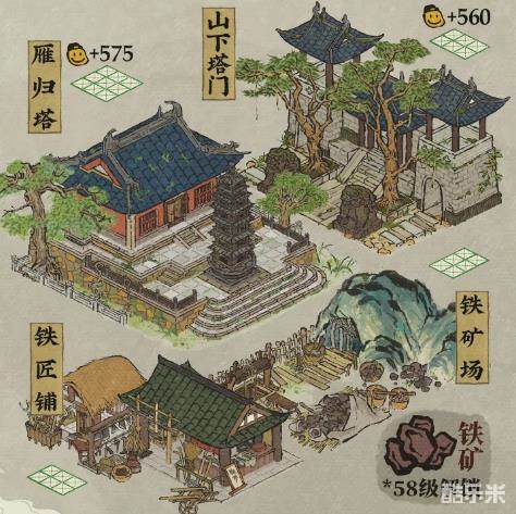 新增「铁矿]相关建筑「铁矿场」、「铁匠铺」、「山下塔门小、「雁归塔」。