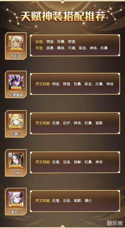1、在天赋技能搭配方面,苏利耶1技能稳定叠加【曜阳灼烧】,3技能追加攻击具有高爆发,物连为必选;狂暴、穿透为传统输出必备。