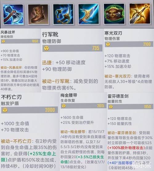 霍芬德圣剑可以说是非常契合猎鹰的一个装备,提供物理攻击的同时还提高了能量抗性,并且被动还会再受到较高伤害的时候给与和物理攻击挂钩的护盾和回复生命值的效果,虽然这个被动效果冷却长达45秒,但我们要知道,猎鹰的优势并不在团战,一般都是单带,而这45秒在后期是够用的了,之将这个装备留在最后出,就是为了弥补猎鹰后期太弱势的情况!