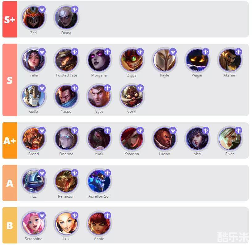中单位劫被小砍了一刀,皎月依旧强势,莫甘娜强度也是蛮不错的,比天使合适走中。