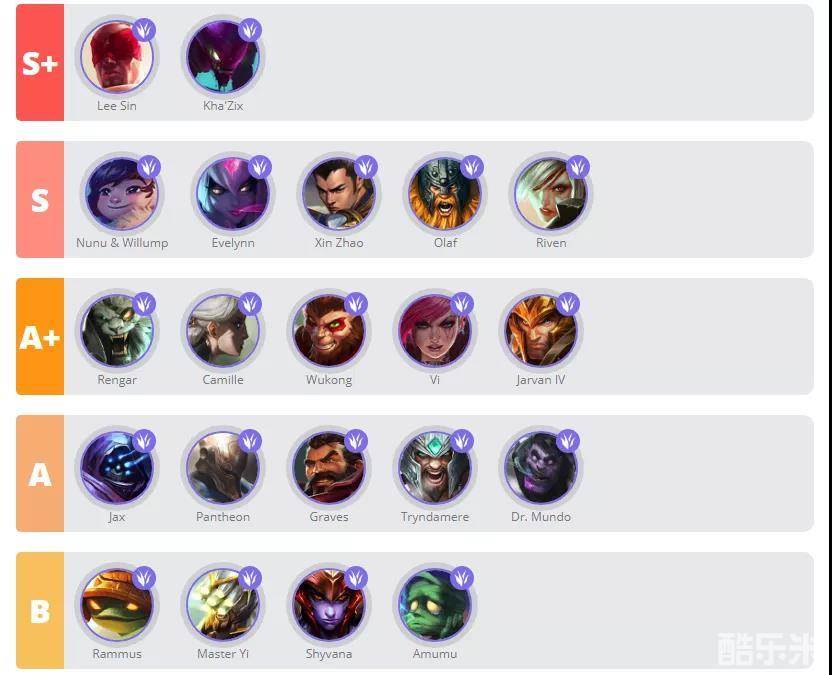 打野位对比上个版本无太多变动,瞎子螳螂一直占据S+,奥拉夫、努努、赵信都属于是伤害高,又扛得住的类型,在现今版本比较吃香。龙龟和木木这两个坦克不是太适应当前版本,剑圣和龙女则是容错率低,死一两次后基本上就0作用了。