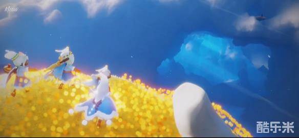 与好友成功救助困境中的光之生物,被治愈的遥鲲与飞鸟环绕身侧,在布满橙色小花的草地上腾空而起,和光之生物们一起嬉戏玩闹。