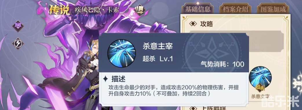 3、超杀技能,杀意主宰,攻击血量最少的敌人造成高额伤害,并提升自身10%攻击力;