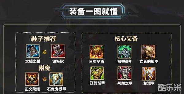 3、后续装备为亡者的板甲和狂徒铠甲,板甲可以增加血量和护甲值以及少量移速提高生存能力。被动可以提高移速并且对敌方造成魔法伤害。狂徒铠甲能够提供大量生命值和生命恢复,极大的提升了蒙多的生存能力。