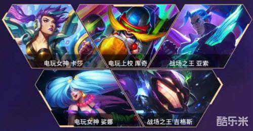 1、电玩系列:电玩女神-卡莎、电玩上校-库奇、战场之王-亚索、电玩女神-娑娜、战场之王-吉格斯
