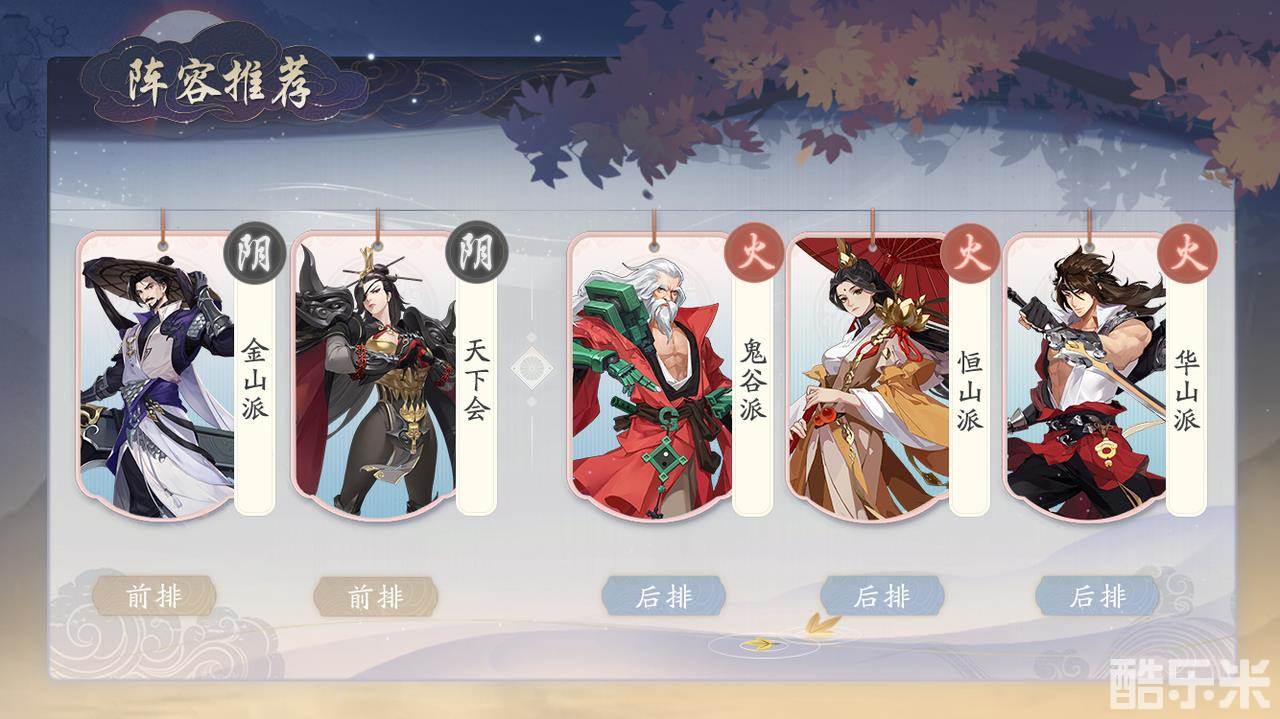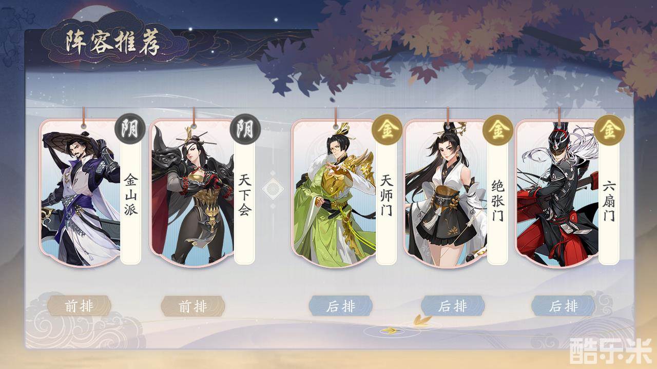 这套阵容呢攻防属性也是非常全面哒~鬼谷派的群伤能力虽然不强,但是可以率先压低敌方血线,然后可以给华山派一个很好的切入空间,远近输出配合起来可是非常无敌的。而在防守方面,恒山派的群体减伤属性能让前排变得更硬,而且后排也能有很强的自保能力和输出效率,而金山派和天下会自然也能给C位创造非常好的输出环境啦~
