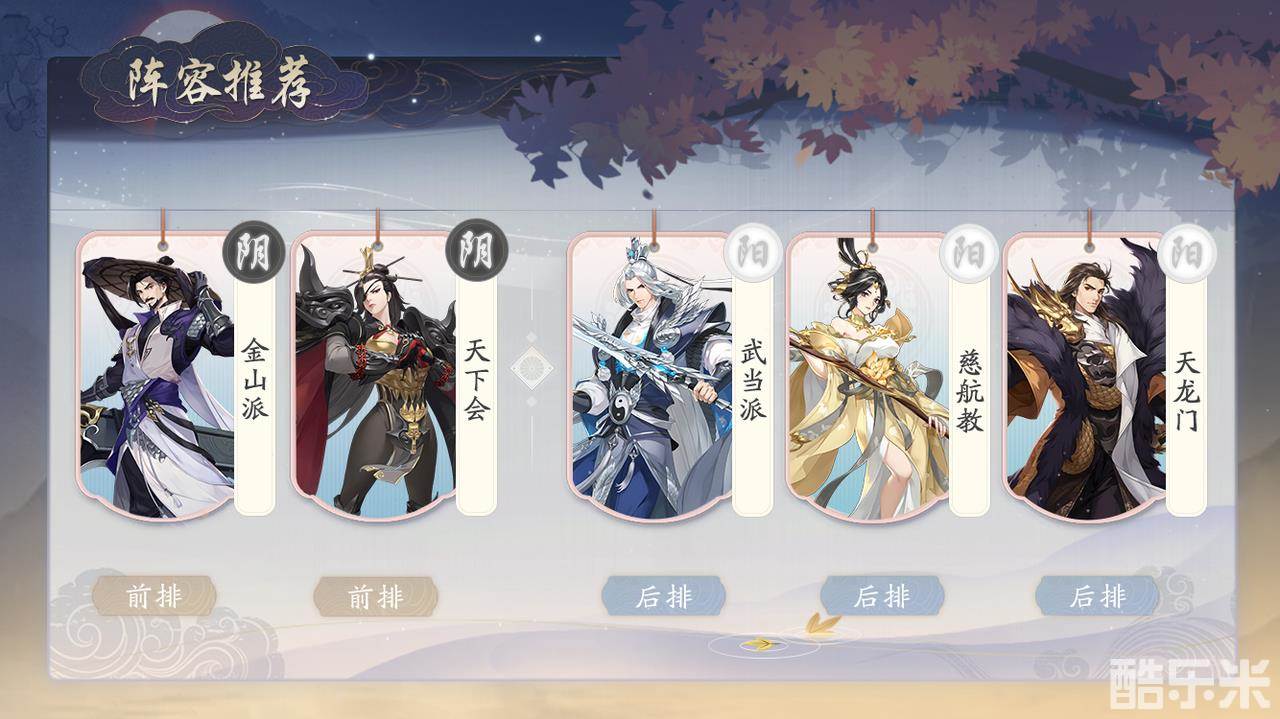这套阵容可以说是灰常全面!金山派加上天下会两个强硬前排,能在前面吸引敌方的火力,并且金山派也能够压低敌方前排侠客的血线,给武当派和天龙门足够的启动时间和输出环境,同时慈航教还有着强大的续航能力,能保证伤害打得充足,且前排站得更久,而且敌方也很难切入吼!