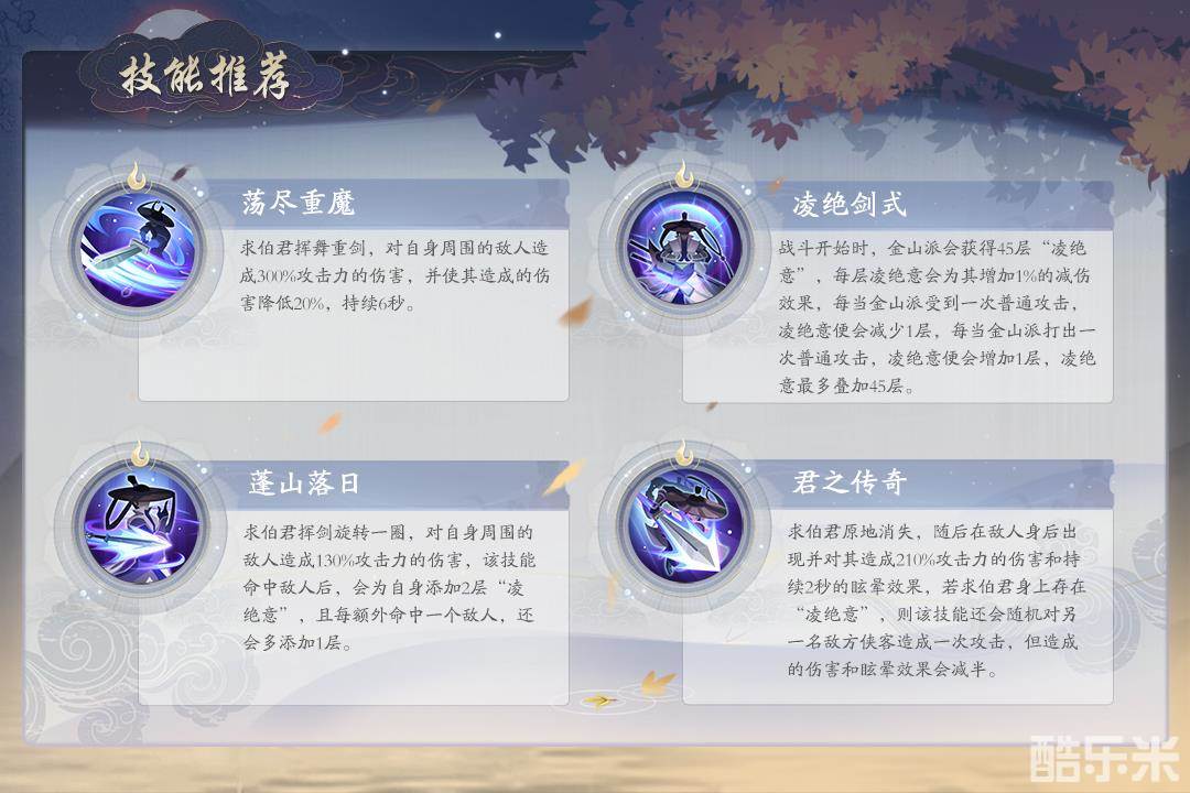 【蓬山落日】求伯君挥剑旋转一圈,对自身周围的敌人造成130%攻击力的伤害,该技能命中敌人后,会为自身添加2层“凌绝意”,且每额外命中一个敌人,还会多添加1层。