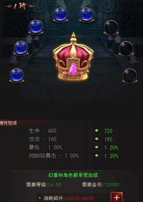 属性加成就是在中间靠左的位置了,可以看到当前提升了1%的暴击伤害和1%的对BOSS暴击几率,当然我这还是进阶的很少的。