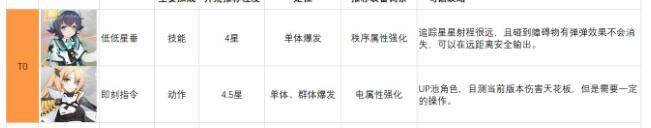 T-1,公测版本出现的全新角色“即刻指令”,目前版本中的角色伤害天花板,但是缺点是不能无脑打输出,需要一定的操作,在单体群体爆发能力上都是非常强力的。目前版本中属于限定卡池的角色,如果有想法的话还是可以抽一下的,要注意一下,这个游戏的抽卡相当的便宜,大家可以剁剁手。