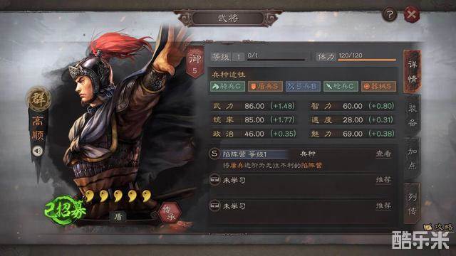 三国志战略版游戏中高顺的卡牌角色能力值很低.但陷阵营的兵种很强大.