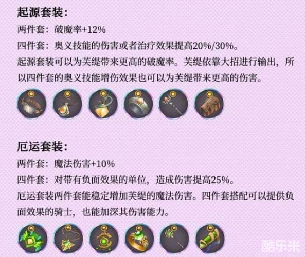 5、装备推荐:启源套装或者是厄运套装。启源套装可以提升破魔率,强化大招的输出能力。厄运套装则是提升法术伤害,4件套针对有debuff的单位可以造成更高的伤害。