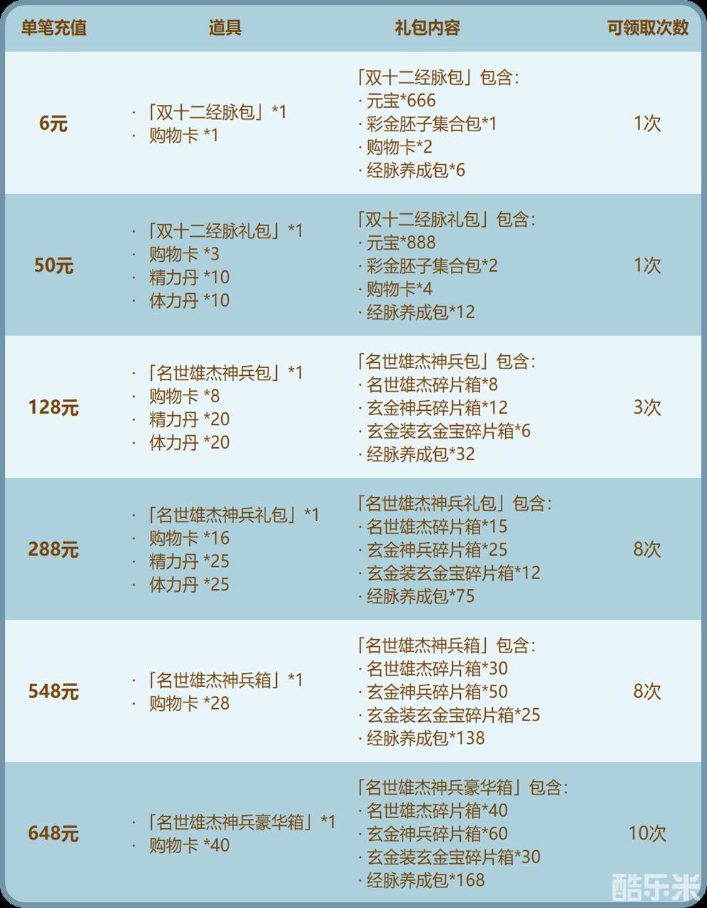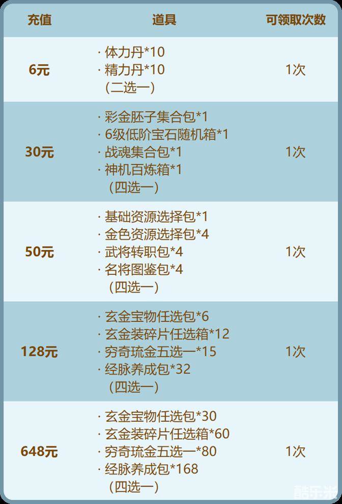 在活动期间少年们单笔充值至指定金额,即可获得名世雄杰碎片箱、玄金神兵碎片箱、玄金装玄金宝碎片箱、经脉养成包、购物卡等资源: