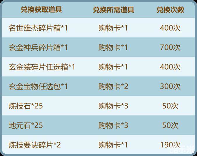 「购物卡」可用来兑换名世雄杰碎片箱、玄金神兵碎片箱、玄金装玄金宝碎片箱等稀有资源: