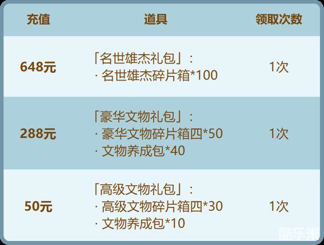 少年们单笔充值指定金额,即可得到名世雄杰碎片箱,以及最新的豪华文物,获取后可增加远古遗迹属性加成,少年们千万不要错过哟~