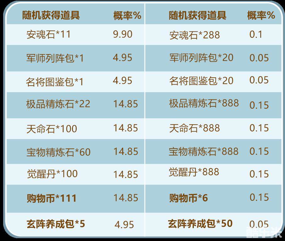 3.「双十二礼盒」可开出:购物币*111、玄阵养成包*50、觉醒丹*888、天命石*888、极品精炼石*888、安魂石*666、军师列阵包*40、名将图鉴包*40、宝物精炼石*888、购物币*6、玄阵养成包*5、觉醒丹*100、天命石*100、极品精炼石*22、安魂石*11、军师列阵包*1、名将图鉴包*1、宝物精炼石*60中的随机1种。