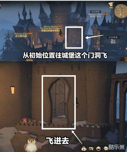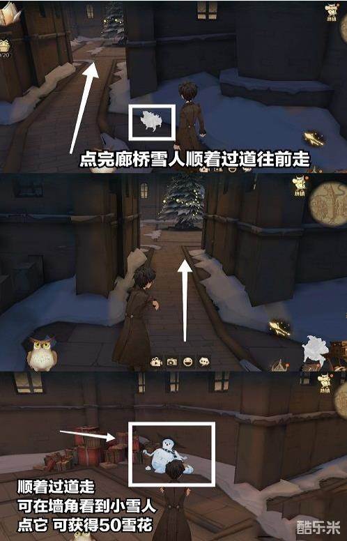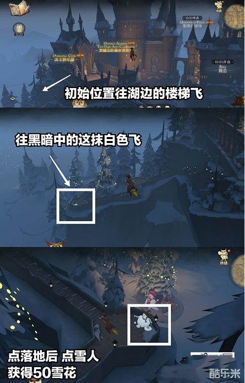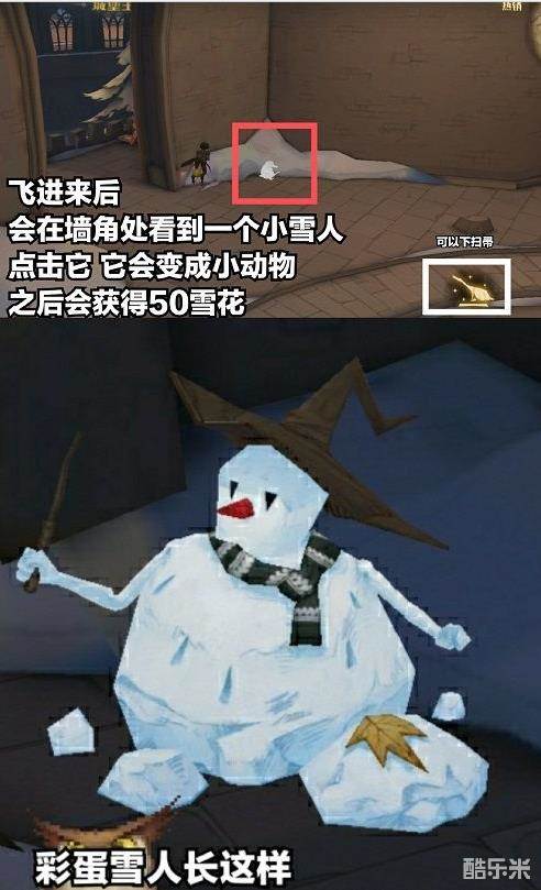 1、湖边雪人——在城堡上空的初始位置往黑魔法防御课教室旁边的门洞飞,穿过去后落地点墙角的雪人,等它变成小动物可以获得50雪花。