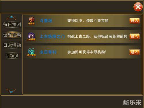 要挑战“上古绝境之门”,玩家可以在天空之城进入,也可以通过“管家”图标进入“世界活动”面板,点击“进入”按钮开始挑战上古之路。