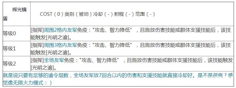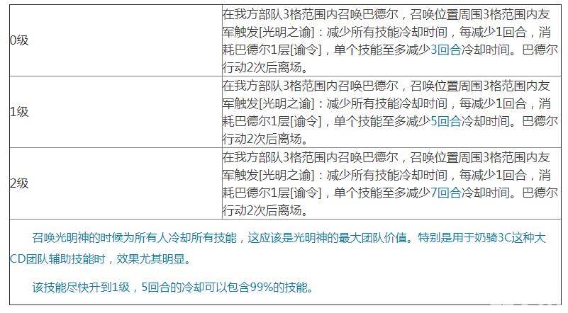 光明神主要特色是减少冷却时间。出场时可以一次性将所有人的所有技能冷却完成,也可以在持续时间让所有人放完技能直接冷却。