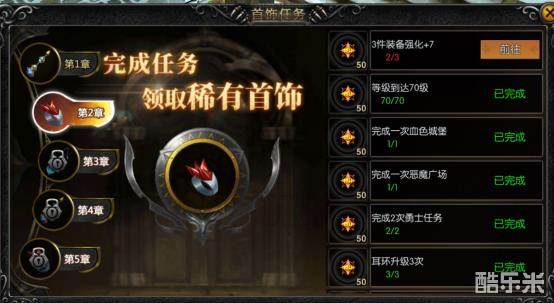 首饰总共有三件装备,分别是项链、戒指与耳环。这些装备并不难获得,只需要完成特殊的首饰任务即可获得一套首饰。首饰任务在画面左上角清晰看见。进入界面,界面分为五个章节,每个章节都有任意数量的任务,完成即可获得本章节的首饰奖励。