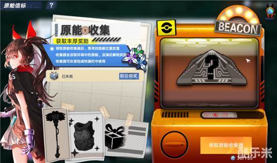 任意时间可领取原能收集器,领取时随机获得蓝色或紫色或金色品质的收集器,每次领取消耗30点体力。放置收集器后立即获得经验,在一定时间内(蓝色24小时、紫色24小时、金色72小时)没有被其他玩家回收即可领取奖励。每次领取收集器有几率附赠原能信号图,根据原能信号图找到其他玩家放置的收集器,也可获得奖励。