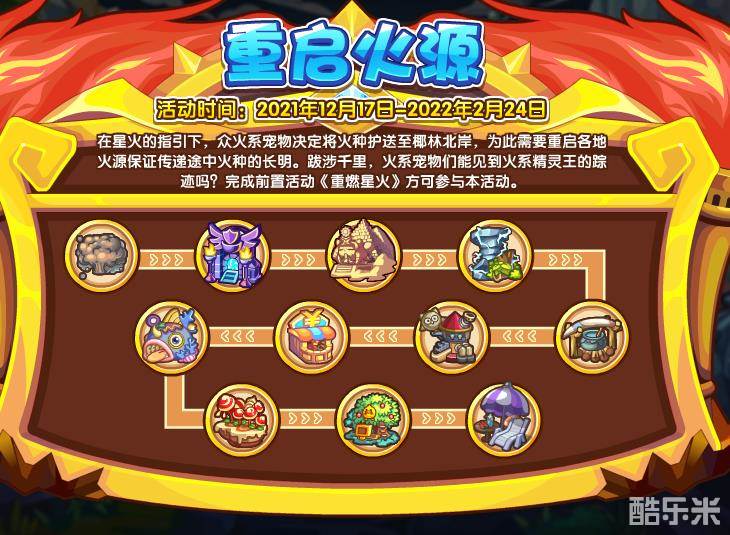 2、点击可进入活动界面。需要注意,只有完成了前置活动《重燃星火》方可参与本活动。活动持续时间是从2021年12月17日-2022年2月24日,本活动预计完成需要2天。完成本活动后可以获得火系精灵王的最后一个线索啦!