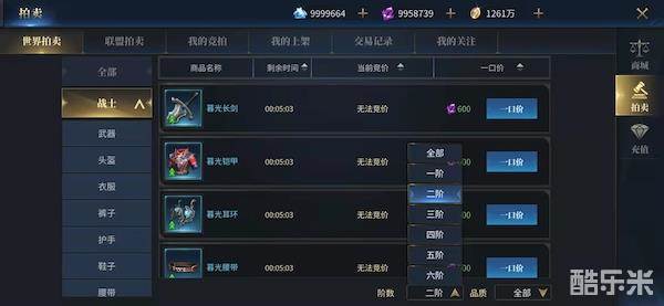 世界拍卖是主要的拍卖行场景,在左侧界面可以通过职业进行选择,点击某职业的下拉菜单,即可选择该职业不同位置的装备。下方“阶数”可以选择不同品阶的装备,“品质”可以按不同的品质进行筛选。