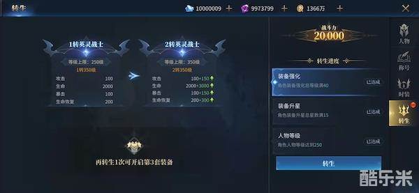 以战士为例,从0转英灵战士转生为1转英灵战士,当满足如下三个条件时,即可进行转生: