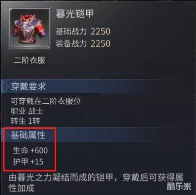 每件装备拥有基础属性,装备品质越高,基础属性就越高。其中武器的基础属性增加攻击,衣服、头盔、裤子、鞋子、护手、腰带的基础属性增加生命和护甲,项链、戒指、耳环的基础属性增加攻击和护甲。