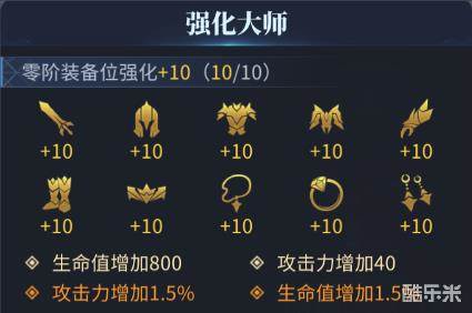 装备强化需要消耗金币和强化水晶。强化可以增加装备的基础属性,当同一阶装备强化达到4/7/10级时可激活强化大师的属性。强化大师可以增加生命值、百分比生命值、攻击力、百分比攻击力。
