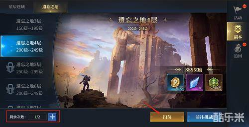 遗忘之地分为19层,解锁关卡需达到对应的等级,关卡等级越高,通关所获得的奖励越丰富。每日有2次免费挑战机会,挑战次数可额外进行购买。当以SSS的评价通过关卡时,可解锁扫荡功能,后续可以直接扫荡,无需再挑战(扫荡获取的奖励与SSS通关奖励一致)。