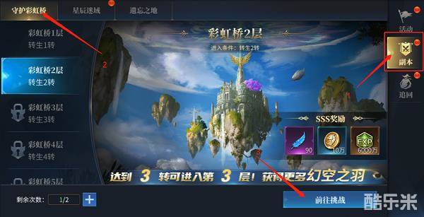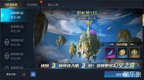 彩虹桥分为10层,提升转生等级可解锁高级副本地图,从而获取更多奖励。每日有2次免费挑战机会,挑战次数可额外进行购买。