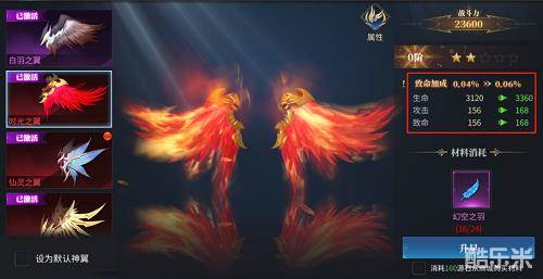 激活神翼可以提升生命值、攻击力、致命以及致命百分比。不同的神翼提供的属性增幅也不同,具体神翼效果可在神翼页面进行查看。如需切换穿戴的神翼,选中目标神翼,在左下角勾选”设为默认神翼”即可。