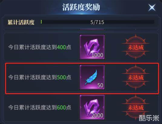 2.活跃奖励:每日活跃度达成500点,即可领取50幻空之羽。