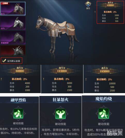 激活坐骑可以提升生命值、攻击力、暴击以及暴击加成。不同的坐骑提供的属性增幅也不同,有的坐骑还拥有坐骑技能,具体坐骑效果可在坐骑页面进行查看。如需切换骑乘的坐骑,选中目标坐骑,在左下角勾选”设为默认坐骑”即可。