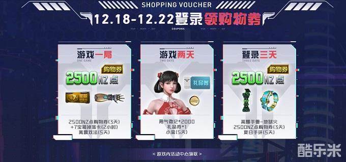 在12月18日-12月22日期间,游戏一局就能领取2500NZ点购物券(3天)、+7宝箱掉落卡(2小时)、离震双法(5天);