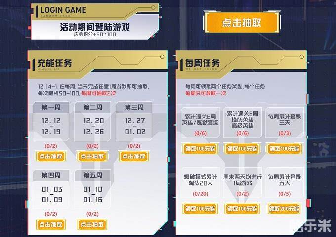12月14日至1月15日,只要完成活动期间的任务,就能抽取积分积攒能量,领取超多福利与道具。