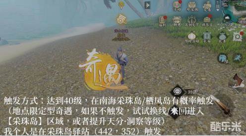 3、触发方式:达到40级,在南海采珠岛或栖凤岛有概率触发。( 地点限定型奇遇,如果不触发,试试换线/来回进入[采珠岛]区域,或者提升天分洞察等级)