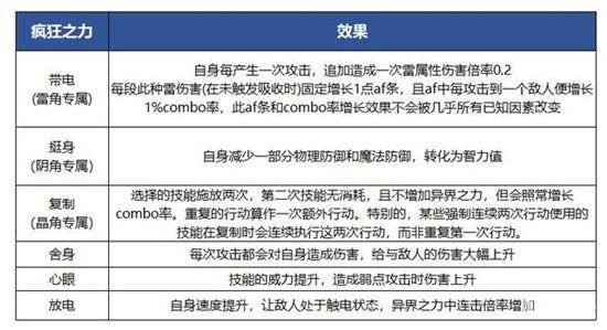 新上线的雷属性、阴属性以及晶属性角色的特殊技能就是“疯狂之力”。战斗时,角色使用“疯狂之力”的机会只有一次,使用“疯狂之力”时,他将代替原有的角色普通攻击槽位,等到技能释放结束以后,“疯狂之力”又会变回普通攻击。