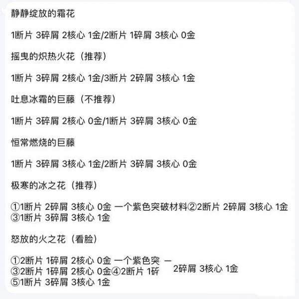 上图所示是一位国服原神玩家统计的刷三种爆炎树(摇曳的炙热火花,怒放的火之花,恒常燃烧的巨藤)和三种急冻树(静静绽放的霜花,吐息冰霜的巨藤,极寒的冰之花)的装备掉落情况,统计完成后玩家还给了一个相应的意见,比如推荐刷极寒的冰之花和摇曳的炙热之花,不推荐刷吐息冰霜的巨藤,而怒放的火之花则是看脸。