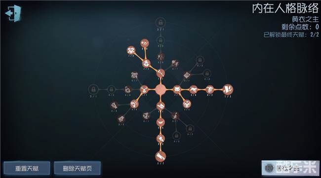 此套天赋主打前期,没有【挽留】在开门战会略显乏力,因此对黄衣之主的操作熟练度要求较高,【破坏欲】可以增强黄衣之主摧毁木板的速度,【底牌】和【巨钳】的配合可以强行将求生者牵往地下室,从而实现对局翻盘,携带【困兽之斗】则是为了针对勘探员、前锋等拥有控制能力的求生者。