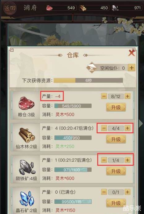 说到仓库,首先要做的是增加仙仆,仙仆越多,就可以用来生产更多的资源。要注意的是,除了食物,大部分资源生产会扣除一定的食物,所以食物的产量有时候会变成负数,这不是游戏bug,是其他的生产扣除的食物大于食物的生产,所以会出现负数。这情况一般有两种解决办法。其一是增加仙仆,这样可以做到食物产出大于消耗,其二是暂时关闭其他材料的生产。