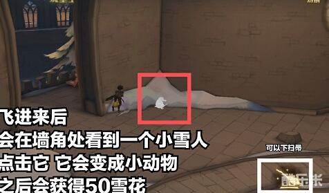 ①湖边雪人是在城堡上空玩黑魔法防御课的门洞方向飞,过去之后就可以看到墙角的雪人了,玩家需要等他变成小动物哦;