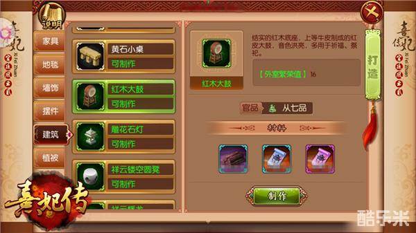 庭院的家具获得途径与内室家园类似,可通过打造或直接购买获得。府邸陈设分为“建筑”与“植被”两大类,消耗建材与外室图纸即可打造满足官品条件的橙色。建筑包含各式古亭、石桌石凳、嶙峋怪石、雕塑宫灯……凡是可于庭院放置的家具摆设一应俱全。植被类目中亦有众多葱茏树木、烂漫花草、荷塘花苑,修筑于庭院内,怡景怡情。每个家具都附带外室繁荣值,推荐小主选择繁荣度较高的家具打造、购买,以快速提升庭院繁荣度等级,增加更多宫斗属性。
