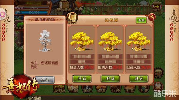 这里的摇钱树并非“福利”中的那颗摇钱树。首先树种就来之不易,小主想要在自己庭院栽种摇钱树需得多多参与家园的许愿树玩法,许愿果中有5%的几率可得摇钱树,获得后将自动种植与庭院内,且只存在2小时。获得摇钱树后,小主们需要做的便是叫上好友来培养,摇钱树被培养后,会掉落5颗果实,丰厚的奖励就在其中。而没有摇钱树的小主,可去别家庭院帮忙培育,奖励多多哦!
