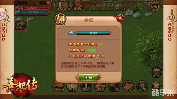 修缮玩法即为之前的府邸打扫改版。当府邸整洁度降低到70后,小主可对府邸进行修缮,活跃度需满350,且每日只可修缮一次。干净整洁的府邸能让皇子健康成长,相反,当府邸清洁度过低时,会影响许愿树的成长,白白浪费许愿次数。如果小主自行修缮后仍达不到理想的整洁度,可邀请同服好友来帮助修缮府邸,可获得各种随机奖励哦!