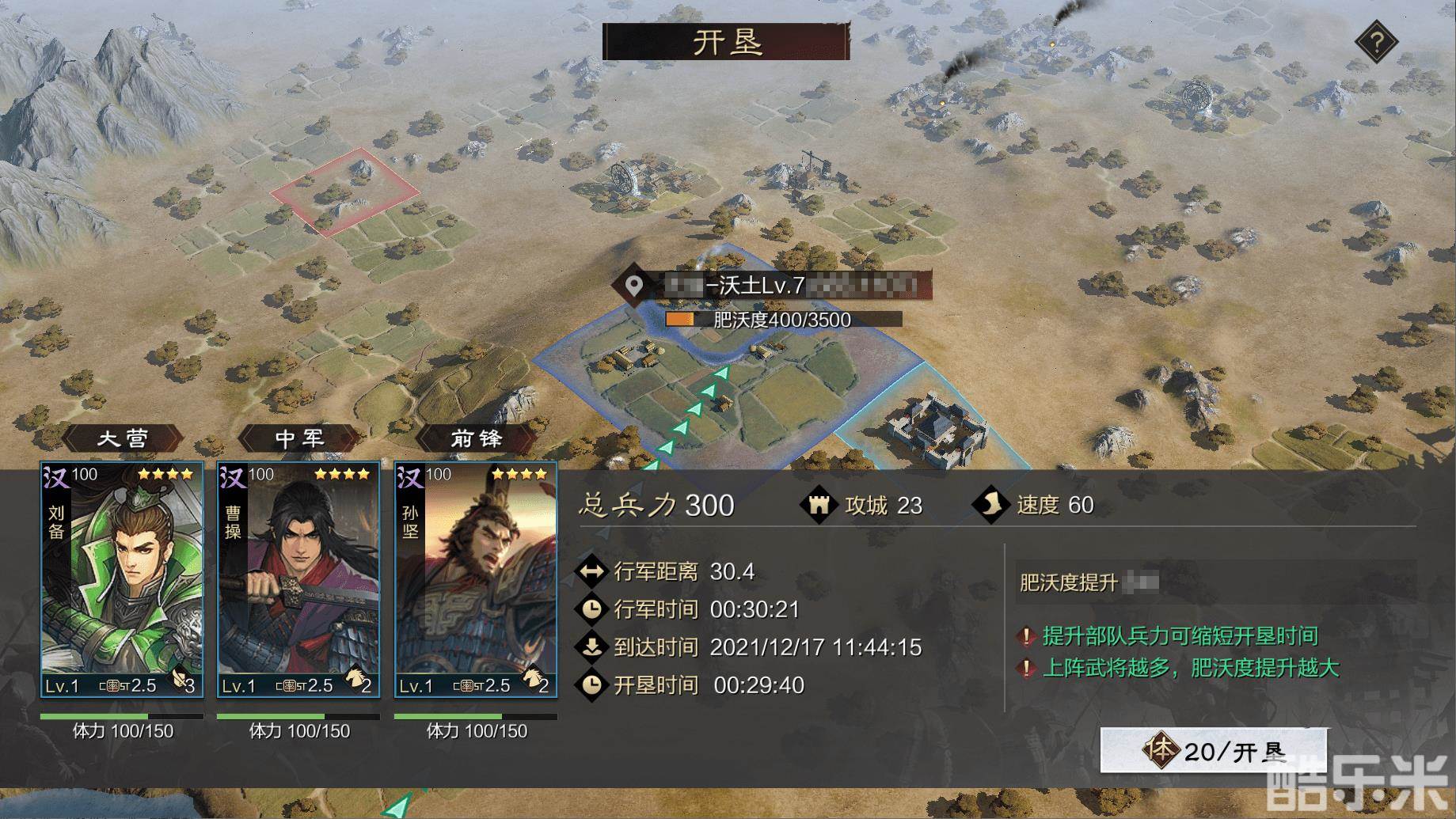 - 前往开垦的部队中,上阵武将越多,肥沃度提升越大