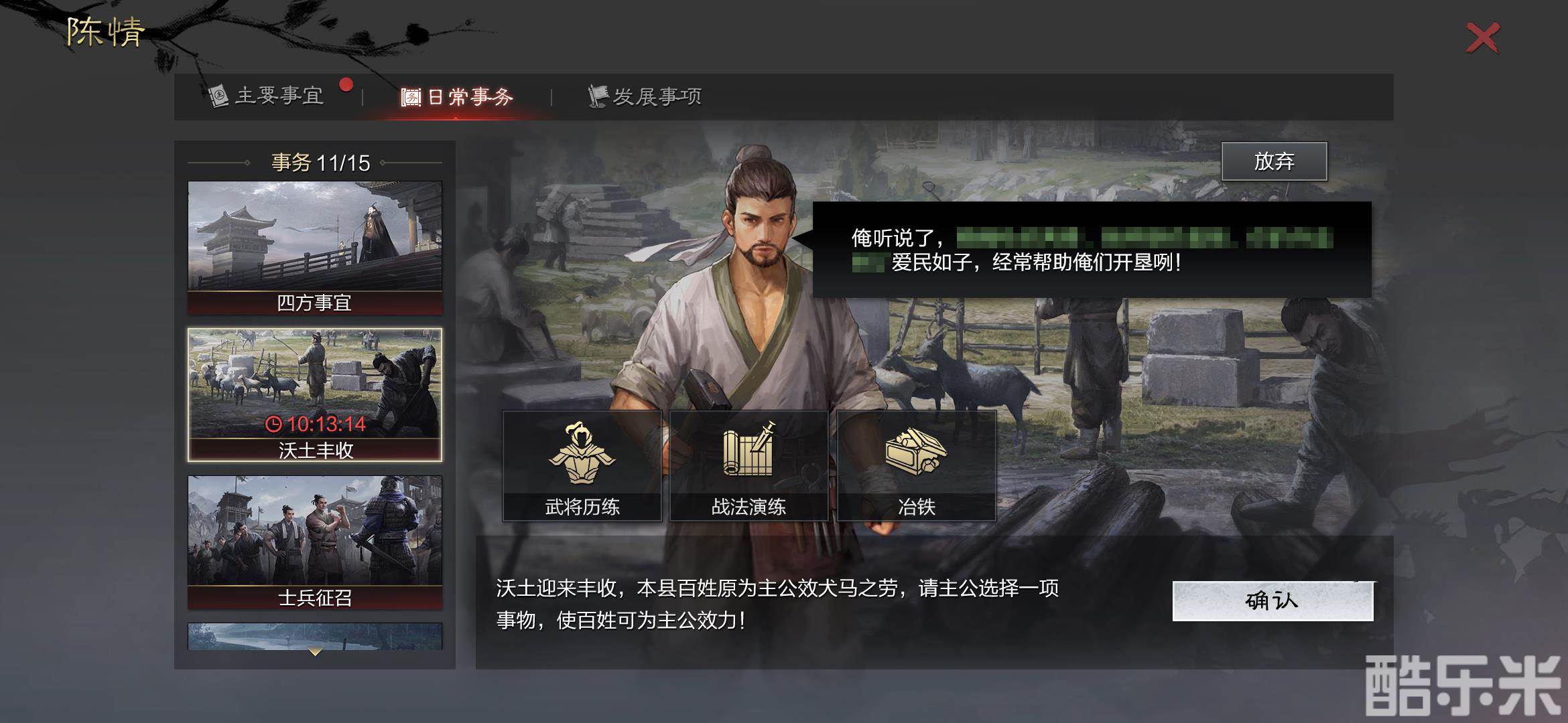 沃土开垦,亲力亲为,不夺农时,则百姓自然安居乐业,多有归附。在沃土开垦玩法推出的同时,新增了2类陈情事件,让主公们感受当地百姓对开垦和丰收的热情与支持: