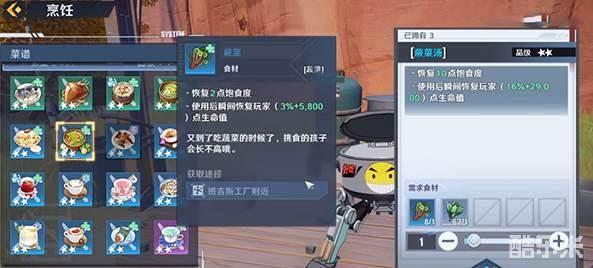 2、蕨菜是一种基础食材,蕨菜+油麦菜可以烹饪“蕨菜汤”料理,食用后提升10点饱食度,并且回复16%+29000的血量,是一种非常常见的回血料理;